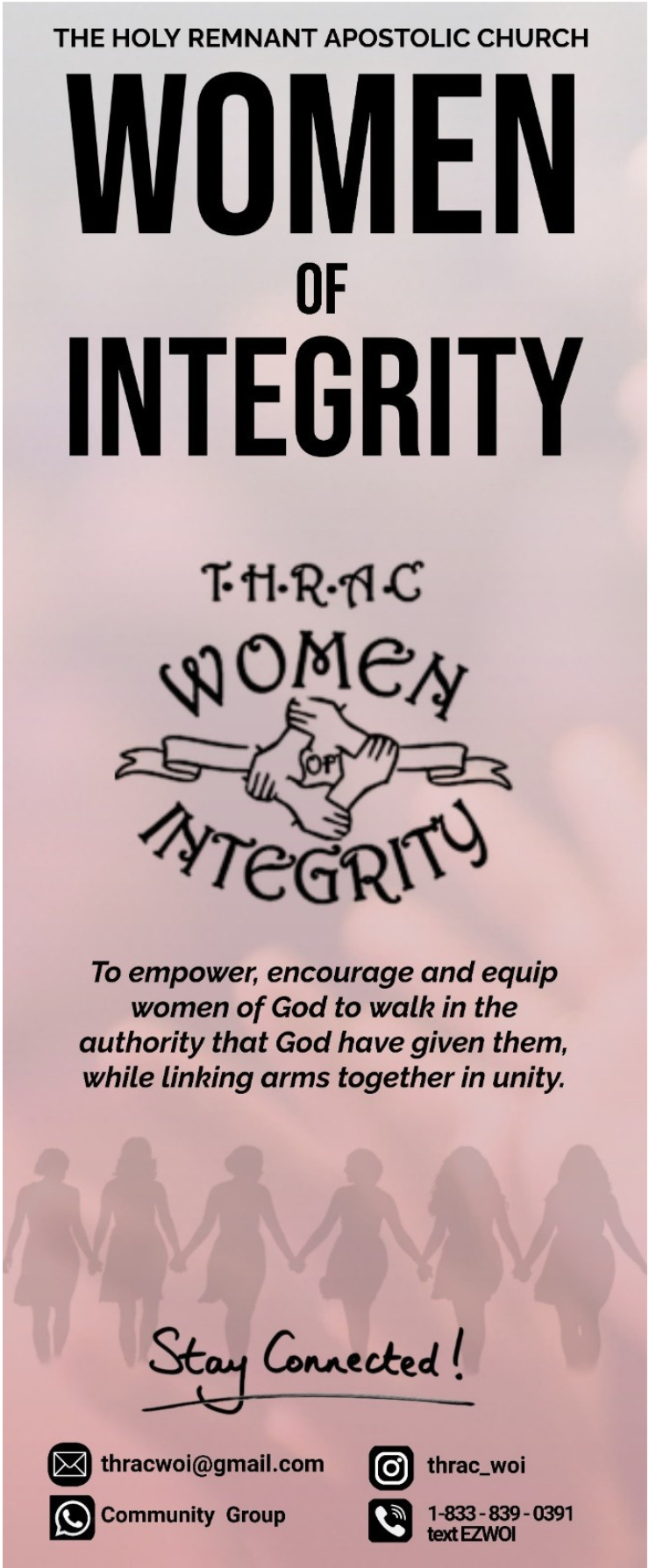 The Women of Integrity (WOI) Department of The Holy Remnant Apostolic Church is a vibrant and purpose-driven ministry committed to uplifting and strengthening women in their walk with God. Our mission is to empower, encourage, and equip women of God to walk in the authority that God has given them, while linking arms together in unity.